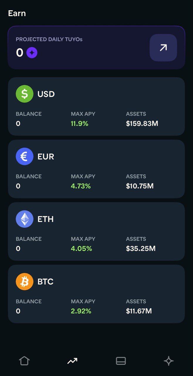 Tuyo.com è una neo bank, che collega il mondo delle criptovalute e la vita quotidiana: un ecosistema che genera rendimento sulle stablecoin e principali criptovalute, pagamenti con carta virtuale che preleva direttamente dal saldo dei rendimenti, IBAN in più valute e swap interno rapido fra decine di asset.